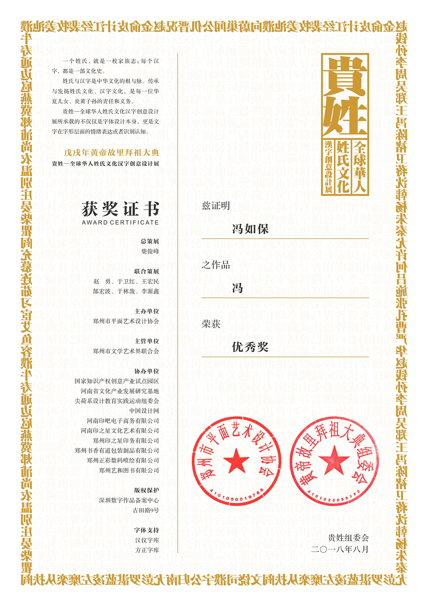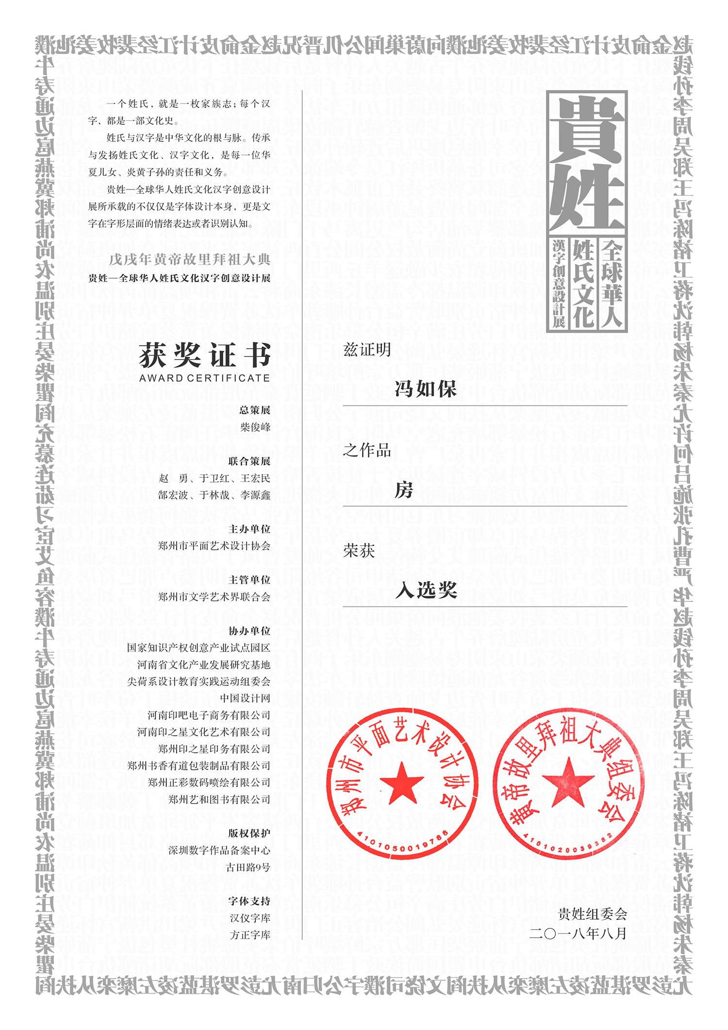 “贵姓——全球华人姓氏文化汉字创意设计展”由郑州市平面艺术设计协会主办,国家知识产权创意产业试点园区、中国设计网等十余家单位联合协办,并由北京汉仪科印信息技术有限公司、河南聚合体文化传播有限公司、苏州青锦文化发展有限公司等战略合作单位和中国设计之窗、古田路9号等数十家媒体提供支持。